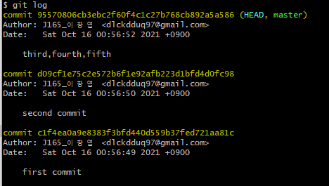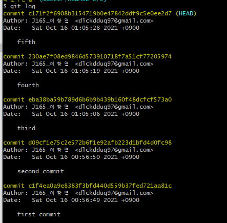 $ git add third.txt $ git commit -m"third" $ git add fourth.txt $ git commit -m"fourth" $ git add fifth.txt $ git commit -m"fifth"이렇게 파일을 나누고 커밋을 남겨주게 되면