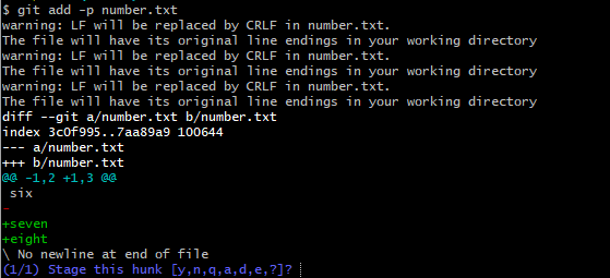 위의 상황에서 seven줄따로 eight줄따로 커밋을 남기고 싶다면?$ git add -p number.txtadd의 p옵션을 사용하면 됩니다!!