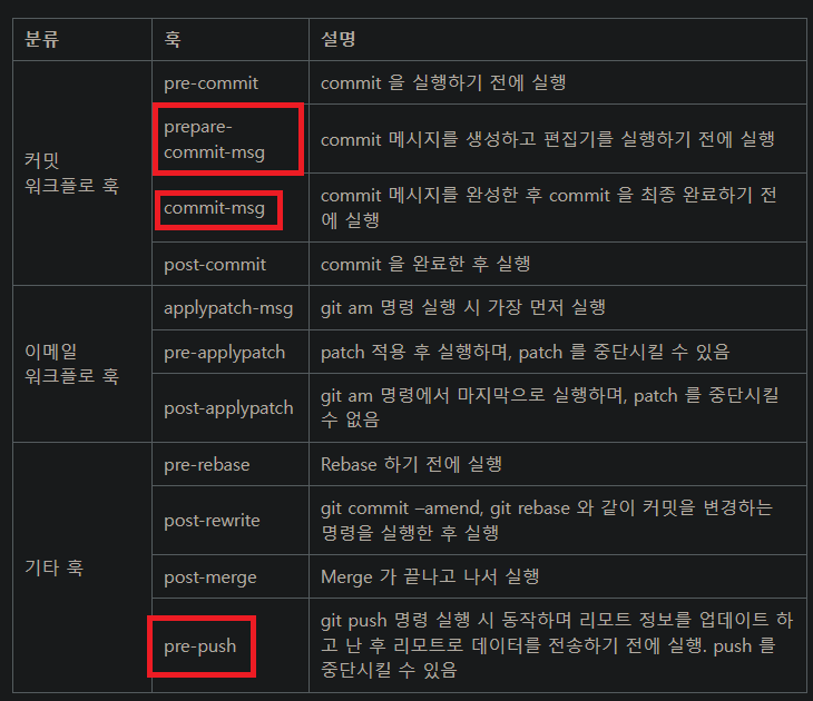 이렇게 있다고 하는데 그 중에서 오늘 소개할 부분은 빨간네모 부분인 prepare-commit-msg, commit-msg, pre-push 입니다!