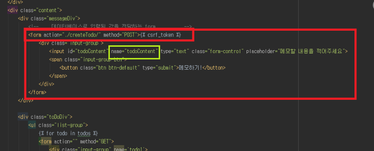 메모를 입력 받는 칸에 대한 html POST할떄 {% csrf_token %}를 적어줘야함