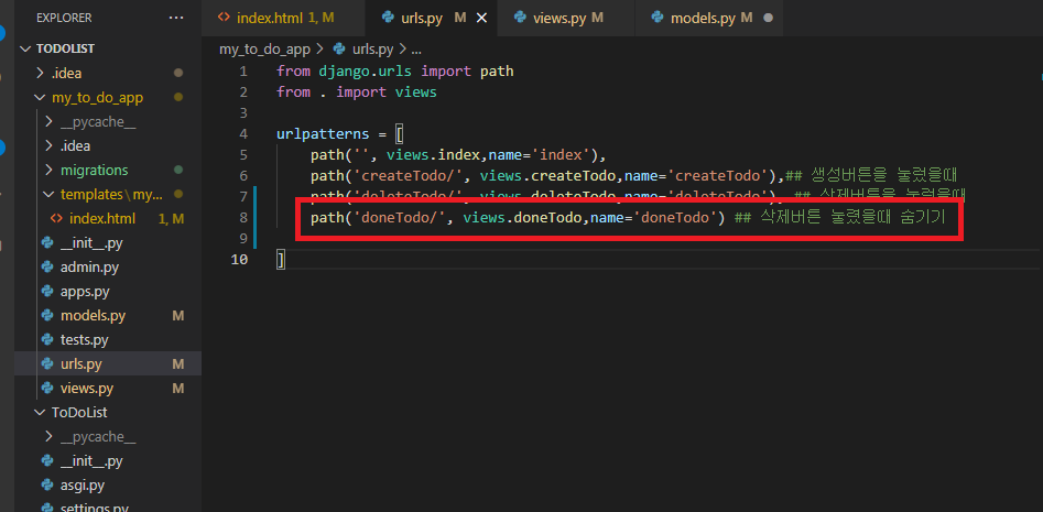 views.py 파일 수정 deleteTodo와 비슷하지만 숨김처리 역할을 하는 함수를 생성한다.